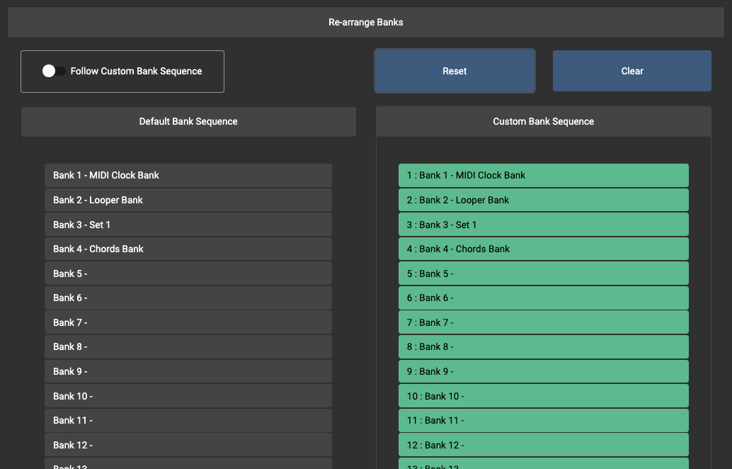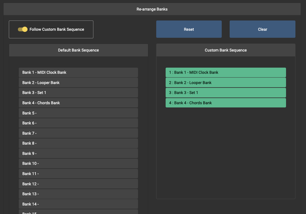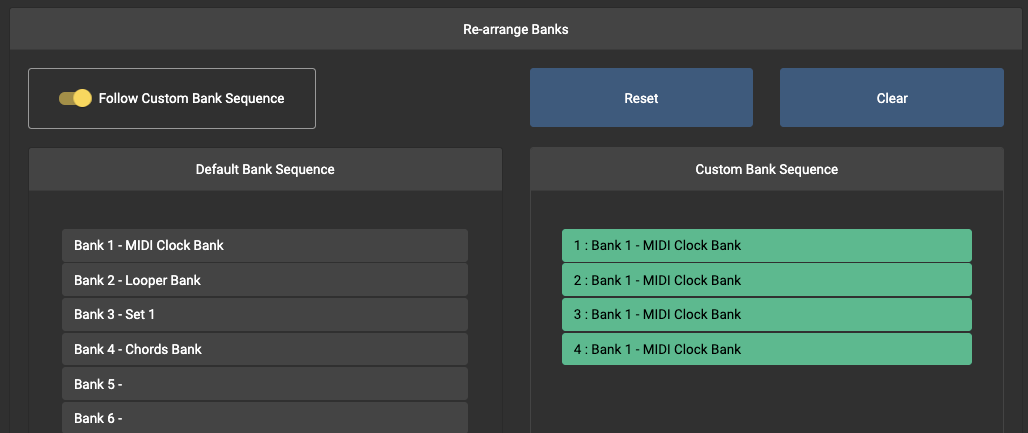 Pressing Clear will clear the Custom Bank Sequence. If there are no banks in the sequence, your controller will default to having only Bank 1 as the Custom Bank Sequence.
