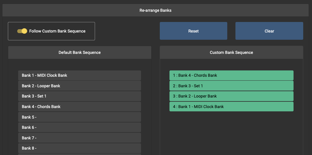 In Firmware v3.8, we introduced the Custom Bank Sequence feature, which allows you to re-arrange your banks in a sequence such that when you Bank Up, the banks loaded will follow your custom sequence. This setting can be accessed in the Controller Settings tab.