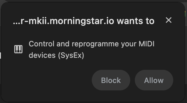 When connecting for the first time, Chrome browser will prompt you to allow access from MIDI devices. Click on Allow.