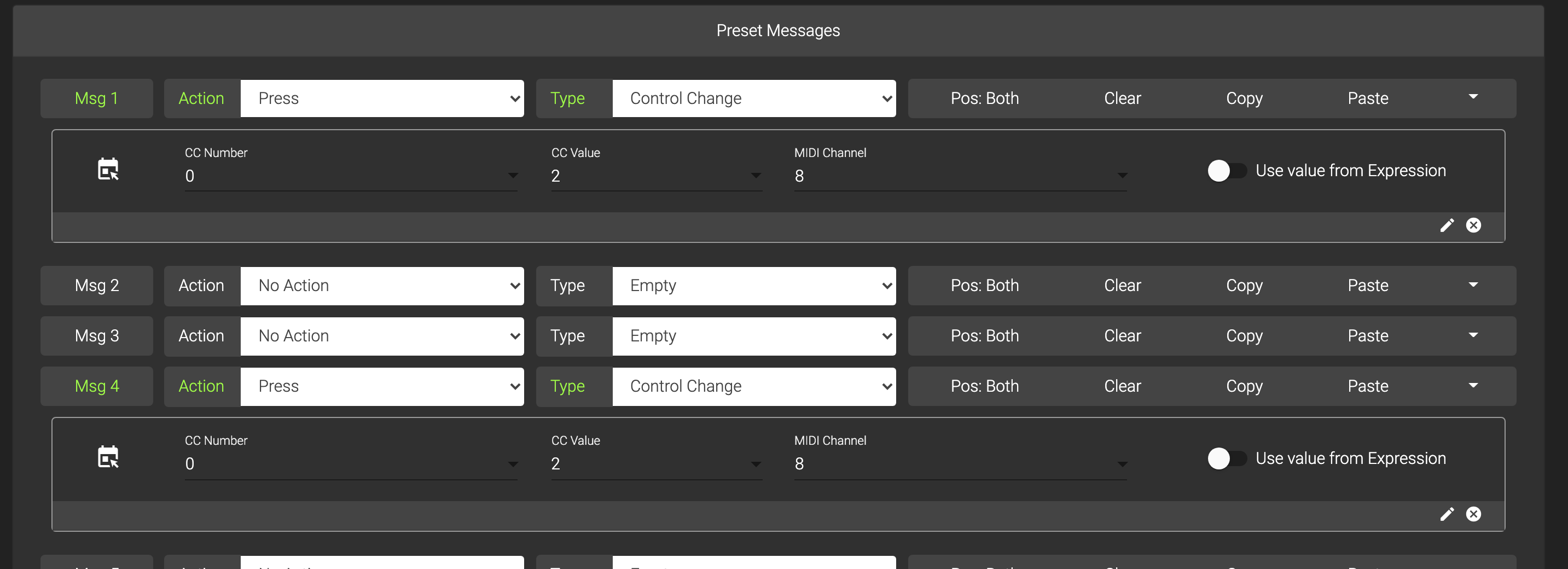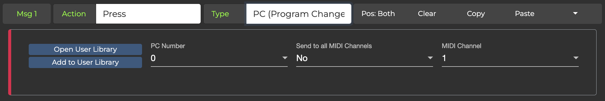If you have got a MIDI message (PC, CC, Note etc) programmed in the editor, you can click on the leftmost Msg n button to send that message to the controller. If your controller’s Cross MIDI Thru setting is turned on, it will forward the message out via its TRS or DIN ports. This is useful if you want to test a specific message with a specific device. For example, setting the MIDI Channel on the Chase Bliss requires a PC message set on the desired MIDI channel. Using this feature will allow you to easily send that message out.