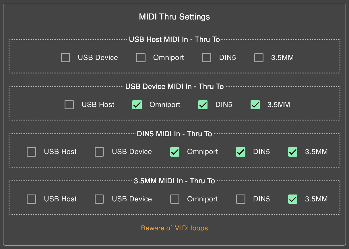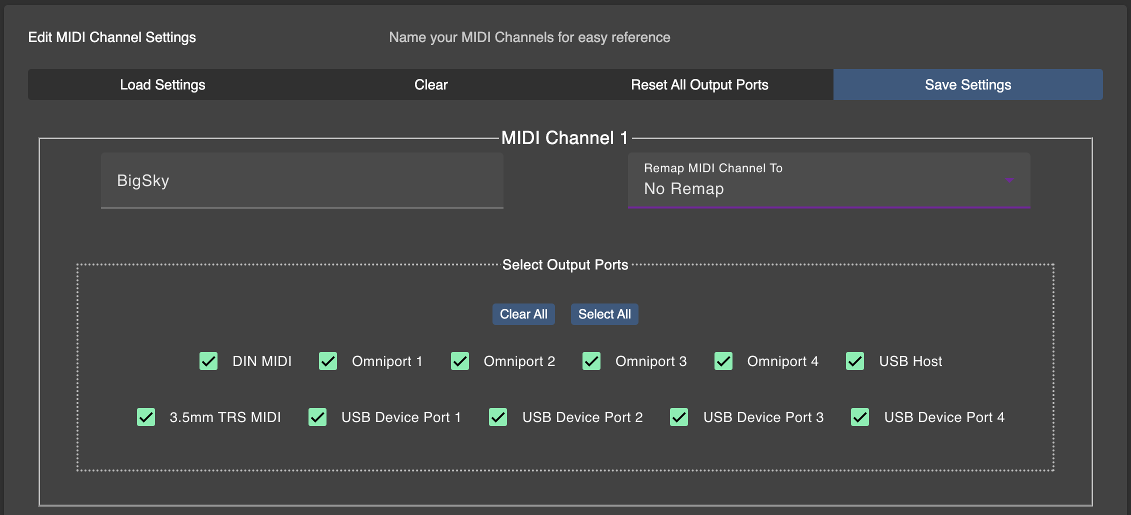 You can also dictate that messages sent via certain MIDI channels be sent only through selected MIDI Outputs. By default MIDI will be sent out through all MIDI outputs simultaneously but you can uncheck the boxes for the MIDI outputs you want excluded.