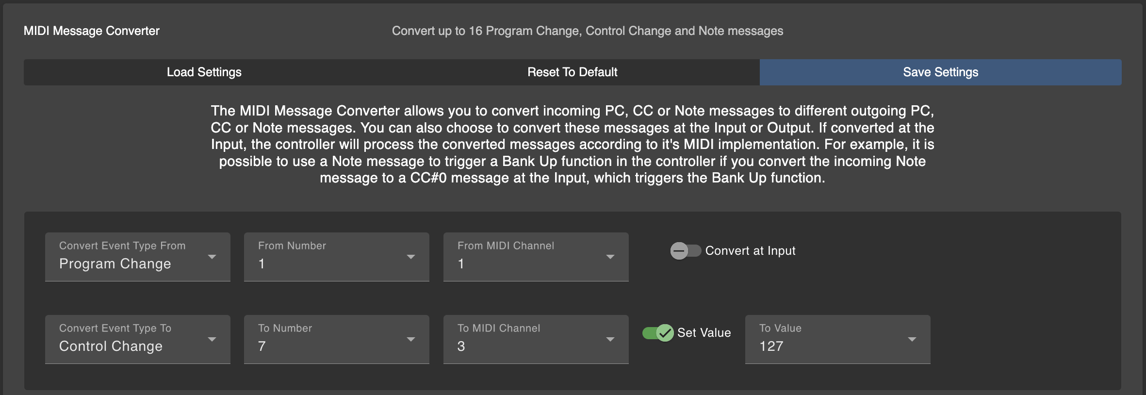 The MIDI Message Converter converts incoming PC, CC or Note messages to different outgoing PC, CC or Note messages. You can choose to convert these messages at the Input or Output. If converted at the Input, the controller will respond to the converted messages according to their converted forms. For example, it is possible to use an external Note message to trigger a Bank Up function on your controller controller if you convert the incoming Note message to a CC#0 message at the Input, which triggers the Bank Up function on Morningstar MIDI controllers.