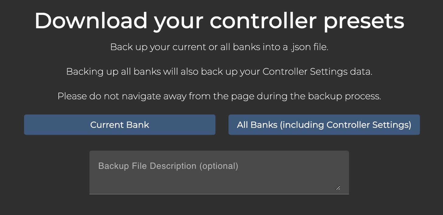 All Banks - Back up all banks to your computer. This includes your controller settings.