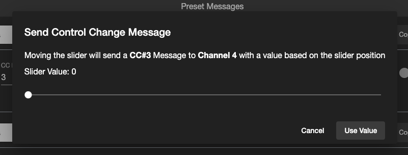 A dialog box will appear to allow you to send CC messages while moving the slider to vary the CC Value. You can apply the selected CC Value to your message.