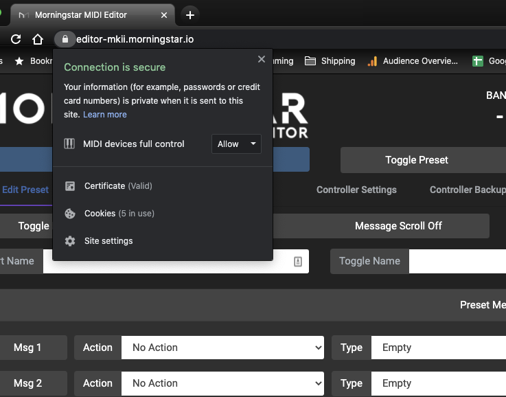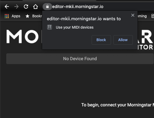 After which, the Editor will load. If you click on the padlock icon next to the URL, you will see that MIDI devices are allowed full control.