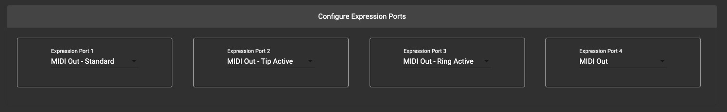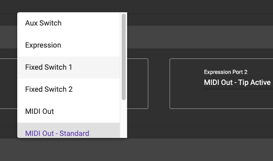 Aux Switch: Use a 1-3 button aux switch to control extra Presets in the bank.Expression: Use an Expression Pedal to engage the Expression PresetsFixed Switch 1: Use a 3 button aux switch to engage the Bank Up, Bank Down and Toggle Page functionFixed Switch 2: Similar toFixed Sw 1but the Bank Up and Down functions are swapped.Fixed Switch Custom: This allows you to select specific functions to use with your Aux Switch buttons. This gives you more flexibility as compared to theFixed Switch 1andFixed Switch 2options.MIDI Out: Configure the port to send MIDI Out using the internal circuit board jumpers (MC8 Only).MIDI Out - Standard: Configure the port to send MIDI Out by the standard way (MIDI on Tip, Power on Ring). This is also known asMIDI Type AMIDI Out - Tip Active: Sends MIDI on the Tip while Ring is left floating.MIDI Out - Ring Active: Sends MIDI on the Ring while Tip is left floating.MIDI Out - Type B: Sends MIDI on the Ring while Tip is powered.