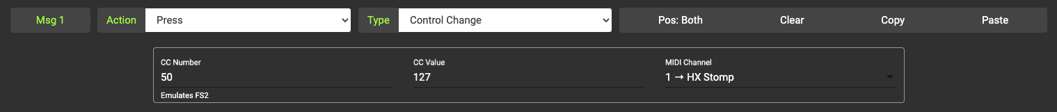 When using Control Change messages, the function of the CC number will also be displayed if the device is available in the MIDI Dictionary. In the image below, MIDI Channel 1 is named as āHX Stompā, and the CC Number 50 executes the Emulates FS2 function on the HX Stomp.