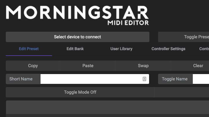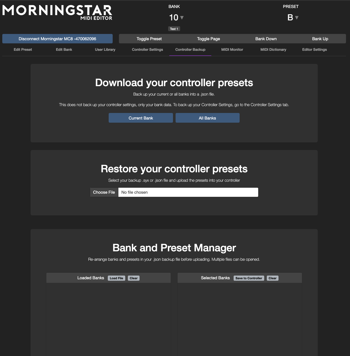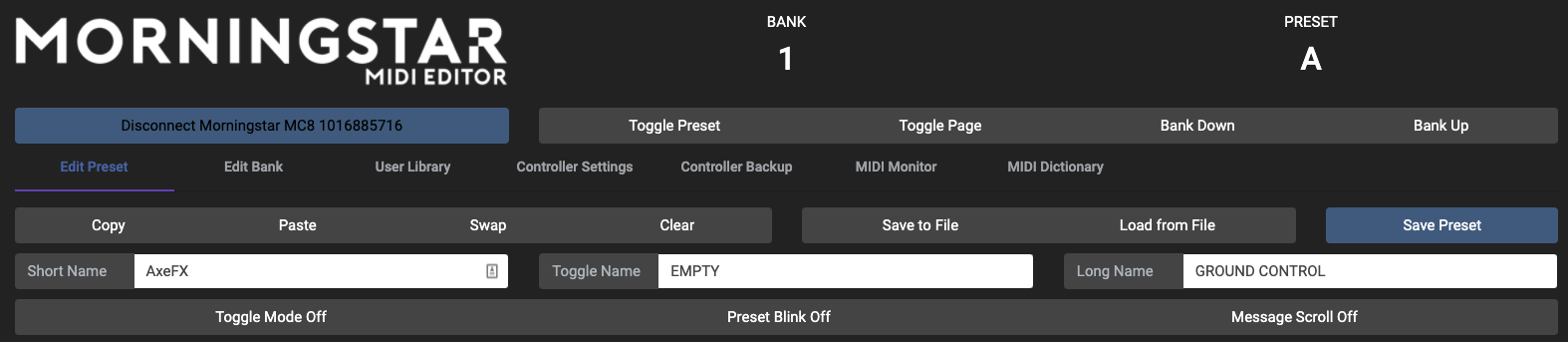 On the top right panel in the Editor, there are a few buttons to allow you to interact with your controller. The current active Bank and Preset is listed as well.