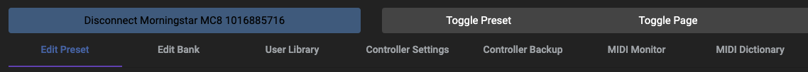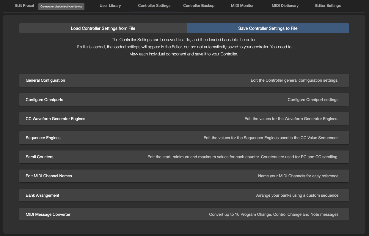 Edit Preset: Edit your current active Preset settingsEdit Bank: Edit your current active Bank settingsUser Library: Allows you to manage your saved PC and CC messages in the Editor.Controller Settings: Allows you to edit the Controller global settings.Controller Backup: Backup and restore your dataMIDI Monitor: Allows you to monitor MIDI messagesMIDI Dictionary: View a collection of MIDI implementations across a large number of devices.