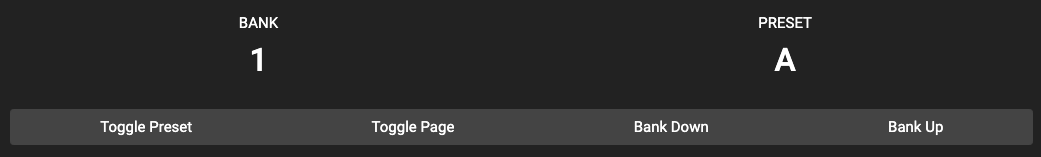 Toggle Preset: Toggle the current active preset between Position 1 and 2.Toggle Page: Toggle the page in the current bank between Page 1 and 2Bank Down: Bank down on the deviceBank Up: Bank up on the device