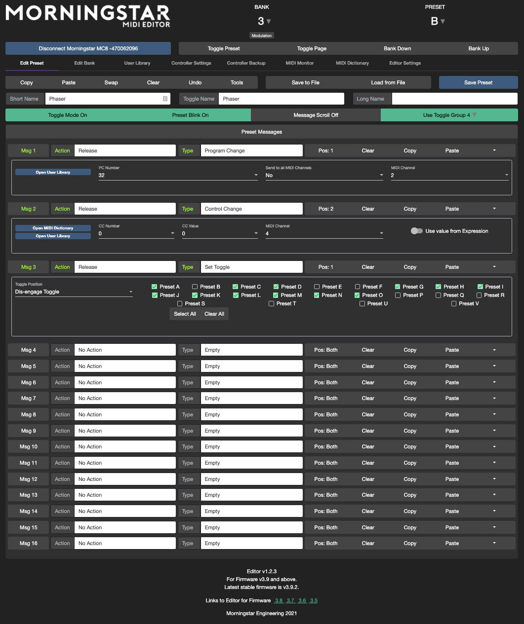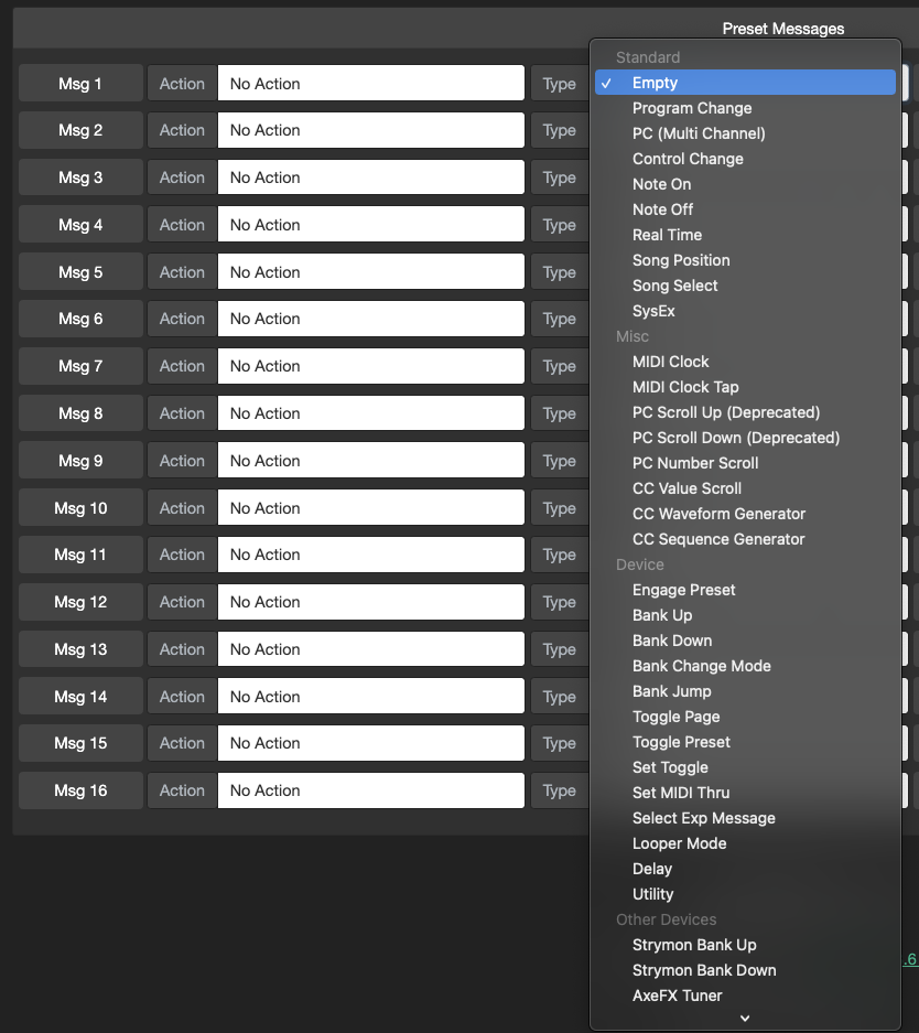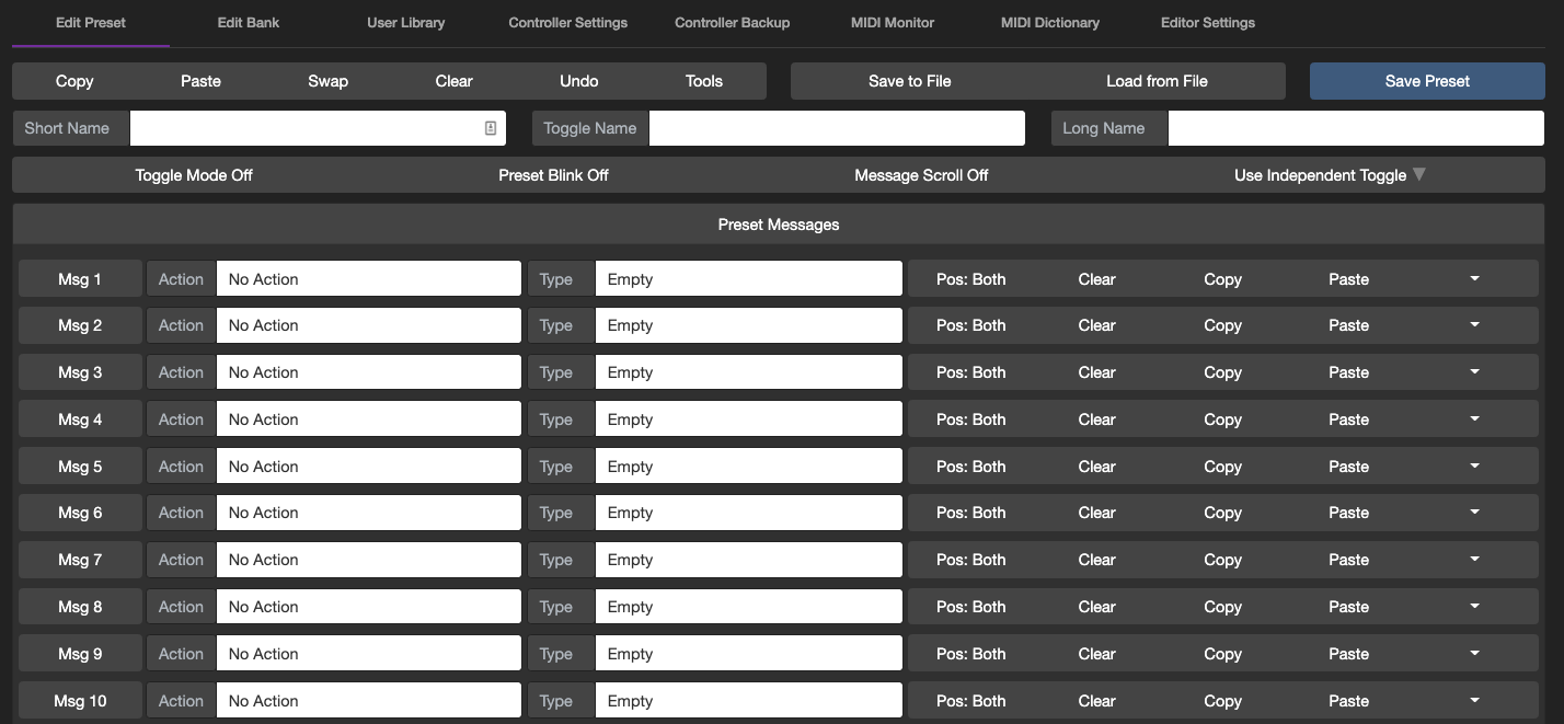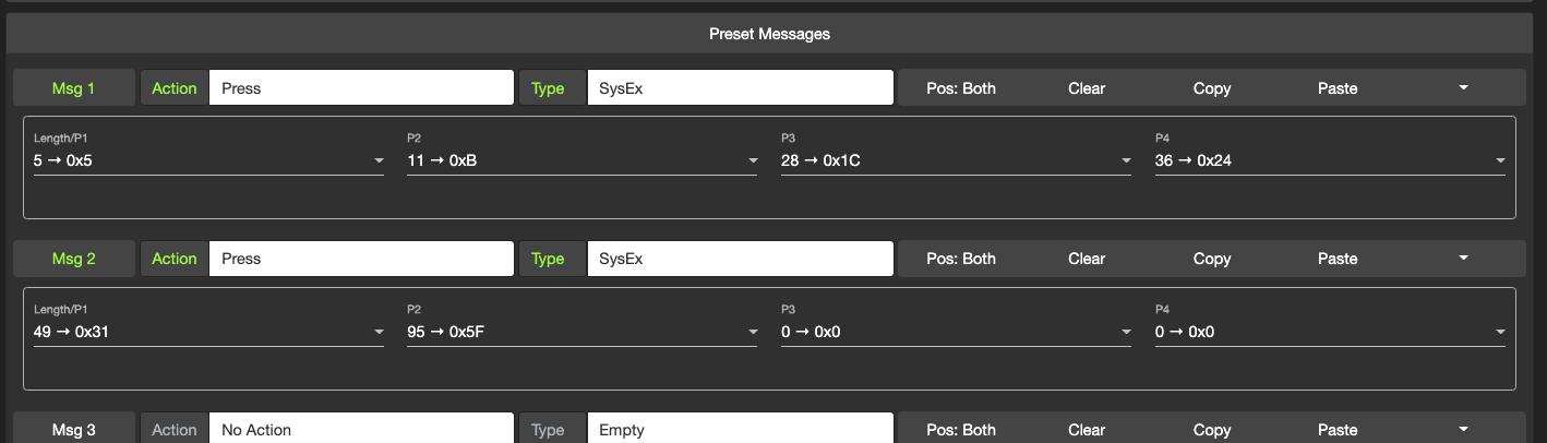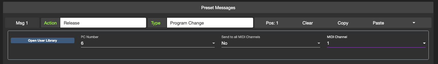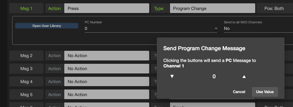 If you have got a MIDI message (PC, CC, Note etc) programmed in the editor, you can click on the leftmost Msg n button to send that message to the controller. If your controllerās Cross MIDI Thru setting is turned on, it will forward the message out via its TRS or DIN ports. This is useful if you want to test a specific message with a specific device. For example, setting the MIDI Channel on the Chase Bliss requires a PC message set on the desired MIDI channel. Using this feature will allow you to easily send that message out.