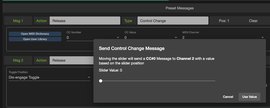 A dialog box will appear to allow you to send CC messages while moving the slider to vary the CC Value. You can apply the selected CC Value to your message.