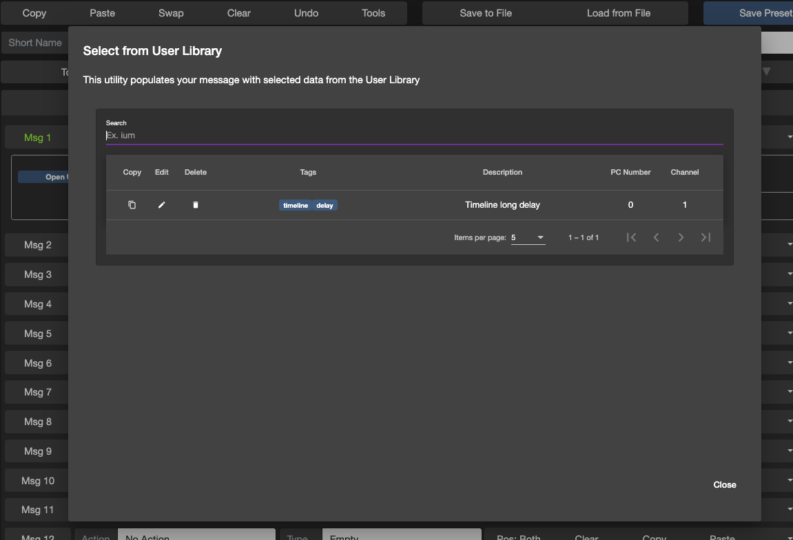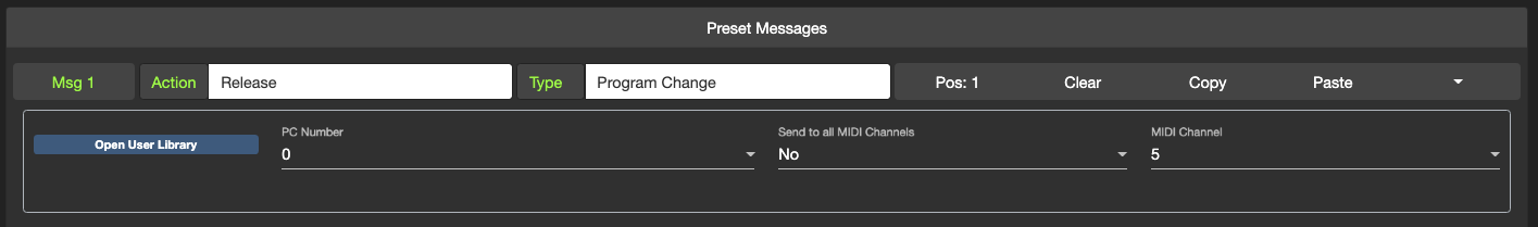 When creating PC or CC messages, you can click on the Open User Library button which will bring out your User Library and allow you to select the message to apply to the preset.
