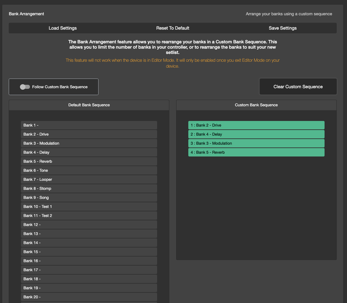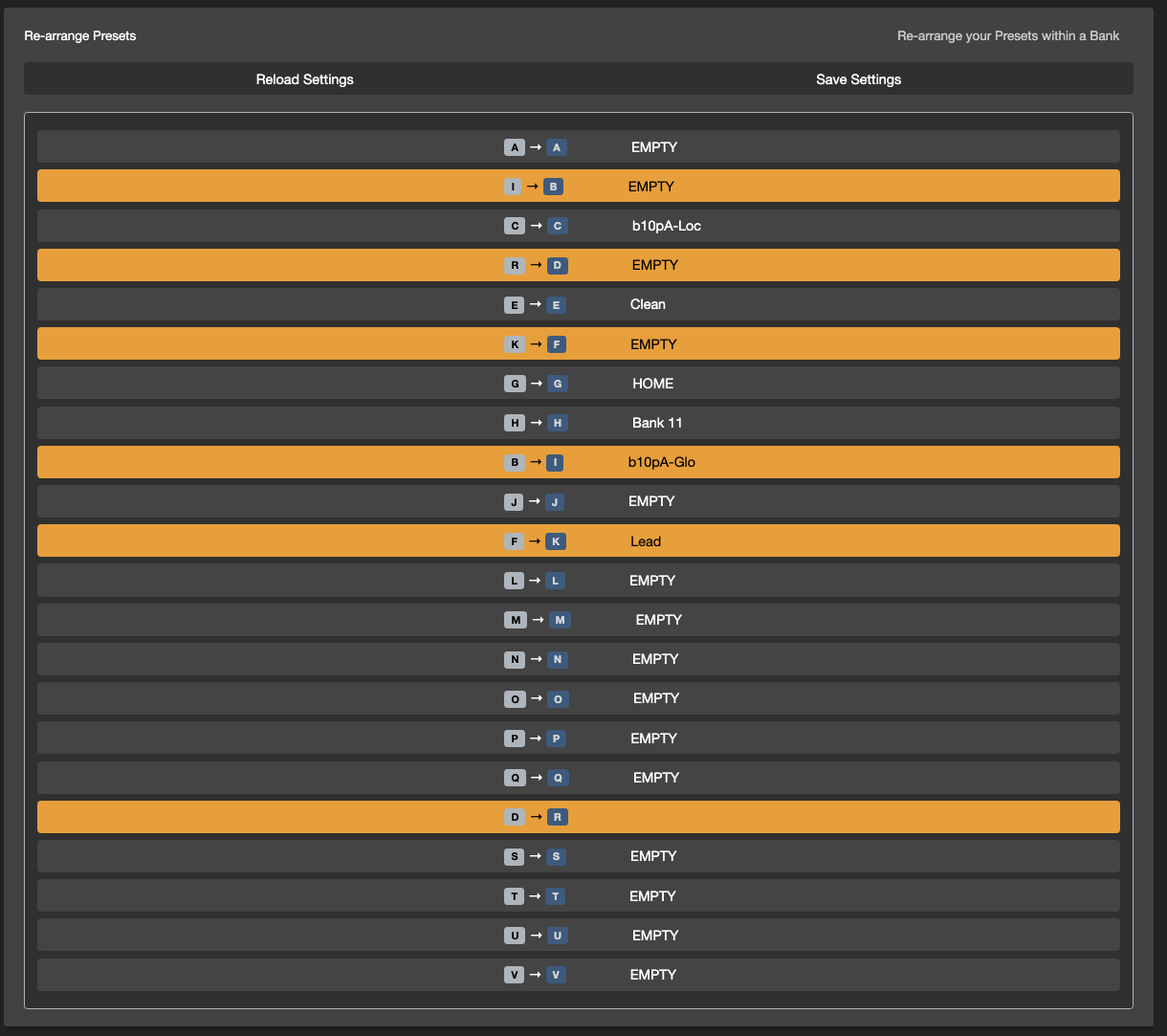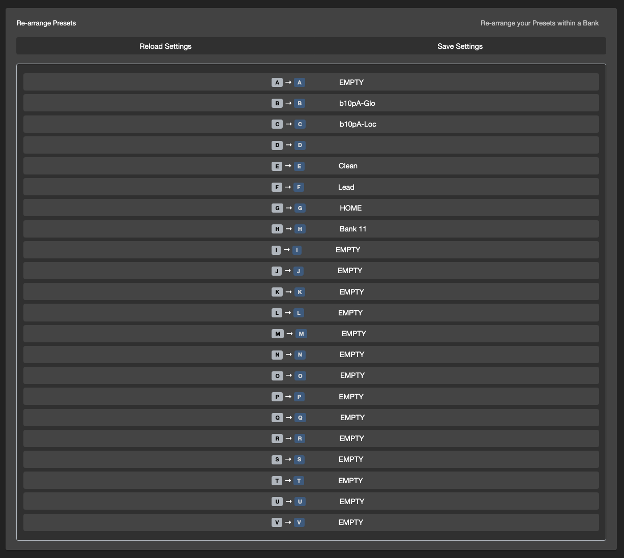 This utility allows you to re-arrange presets within the bank, and then saving it to your controller. You will just need to drag and arrange the presets before clicking on Save Settings