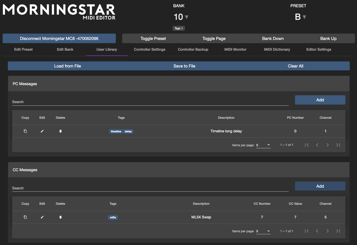 The User Library allows you to store your own PC and CC messages with descriptions so you can easily reference it when creating PC or CC messages.