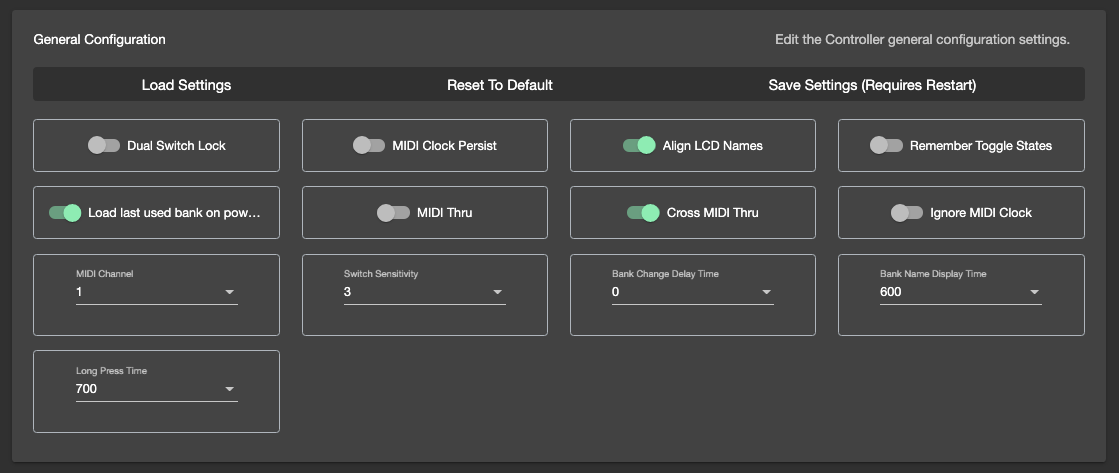 Dual Switch Lock: Whether to lock dual switch presses i.e. Pressing Switch A+B will bank down by default on the MC8. IfDual Switch Lockis enabled, the controller will not bank down when A+B is pressed.MIDI Clock Persist: When the controller is generating MIDI clock signals,MIDI Clock Persistwill ensure that the clock signals continue or persists. IfMIDI Clock Persistis turned off, pressing any switch or moving the expression pedal will stop the MIDI Clock from generating.Align LCD Names: Whether to align the Preset Names to the switch that engages it. If turned off, the Preset Names will align to the left by default.MIDI Thru: Whether to pass incoming MIDI messages from the MIDI IN port to the MIDI OUT Ports.Cross MIDI Thru: Whether to pass incoming MIDI messages from the MIDI IN port to the USB OUT, or USB IN to MIDI OUT ports. MIDI Clock messages are not passed from USB IN to MIDI OUT.Ignore MIDI Clock: Whether to ignore incoming MIDI Clock signalsRemember Toggle States: Whether to save the Preset toggle position in each bank, such that when you change bank, the Preset toggle positions will be where it last was. Turning this feature off will reset all the Preset Toggle positions to default (Pos 1) when the bank is changed.Load last used bank on power up: Enabling this option will allow the controller to load your last used bank when it is powered up.MIDI Channel: Sets the MIDI Channel for the controller. The controller will respond to MIDI messages sent to its MIDI Channel.Switch Sensitivity: How sensitive the switches should be. Default to 3. More sensitive means that there is less delay between pressing a switch and when the Preset executes, while less sensitive means more delay. If the Switch Sensitivity is higher, executing dual button presses may be harder.Bank Change Delay Time: How much delay there should be when changing banks and when the new bank is loaded. When scrolling through banks (i.e. holding the Bank Up function), this delay will affect how fast you can scroll through the banks.Bank Name Display Time: How long to display the Bank Name for. On the MC8 this setting is not used as the Bank Name is always displayed on the screen.Long Press Time: How long should a switch be pressed down to consider it to be a Long Press action.