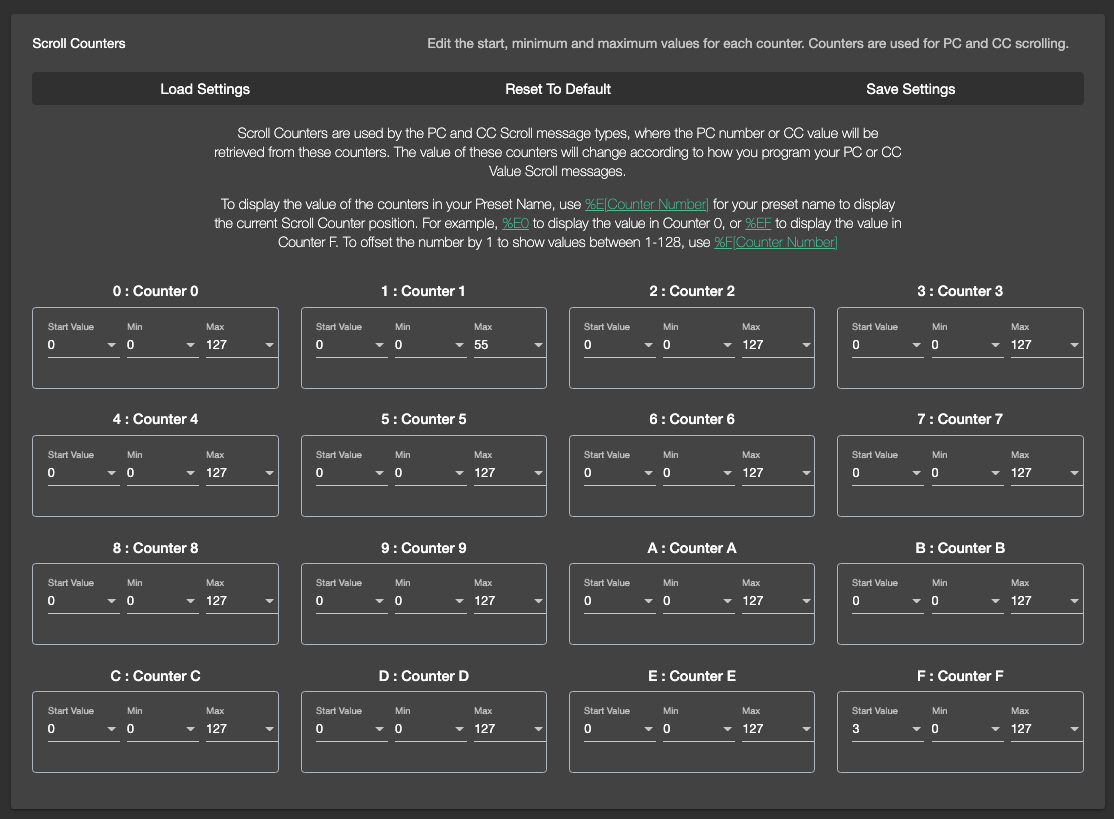 Counters are used for the PC Number Scroll and CC Value Scroll message types.