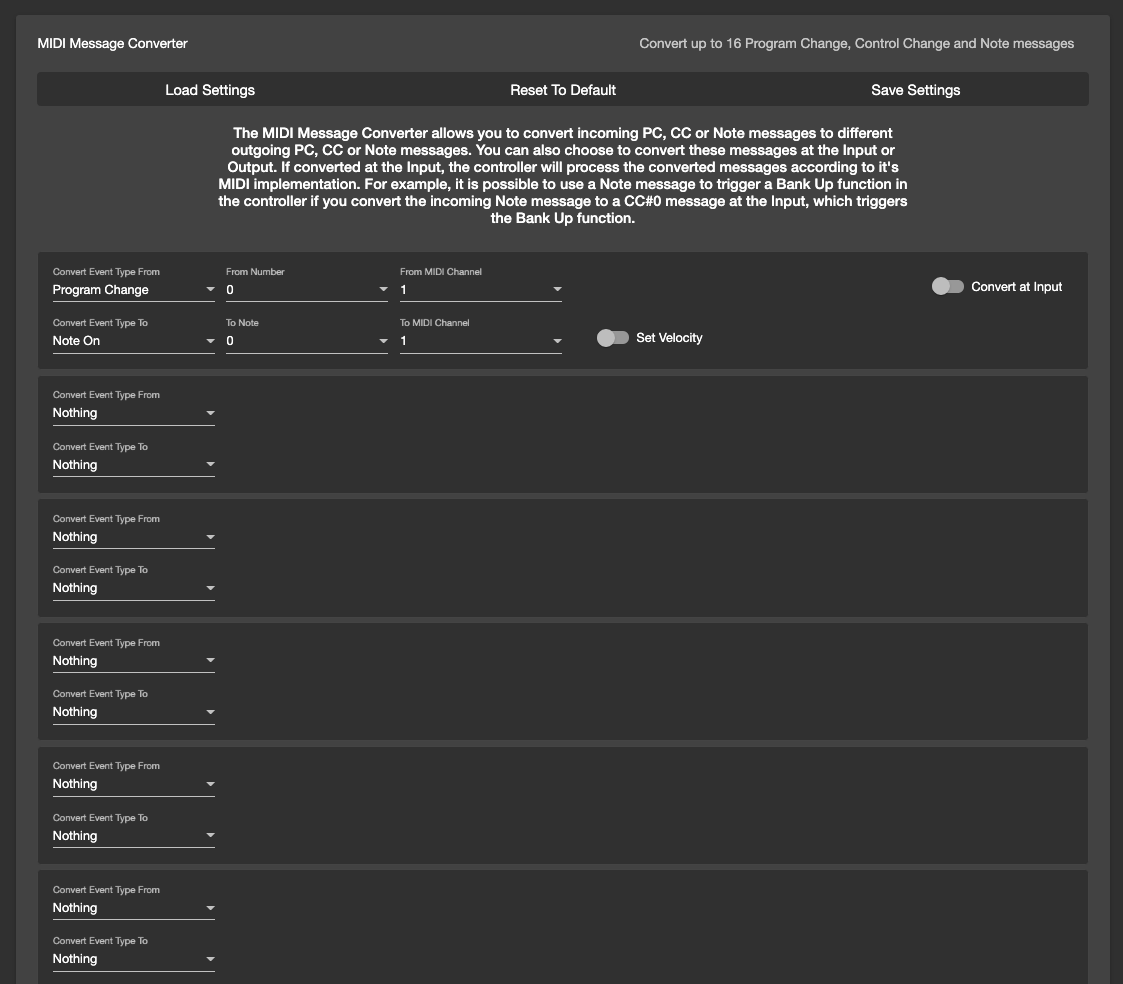 The MIDI Message Converter allows you to convert incoming PC, CC or Note messages to different outgoing PC, CC or Note messages. You can also choose to convert these messages at the Input or Output. If converted at the Input, the controller will process the converted messages according to it's MIDI implementation. For example, it is possible to use a Note message to trigger a Bank Up function in the controller if you convert the incoming Note message to a CC#0 message at the Input, which triggers the Bank Up function.