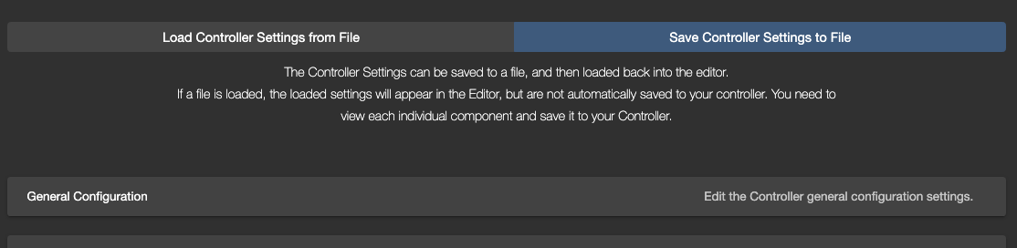 When you load a Controller Settings file in the editor, the data is not automatically saved into your Controller. Instead, the settings are loaded into the editor only. You can then view each tab (General Configuration, Configure Omniports etc) and then edit and/or save the settings in each section to your controller.