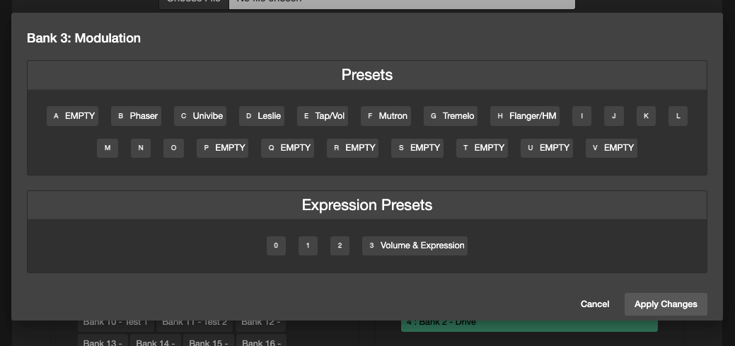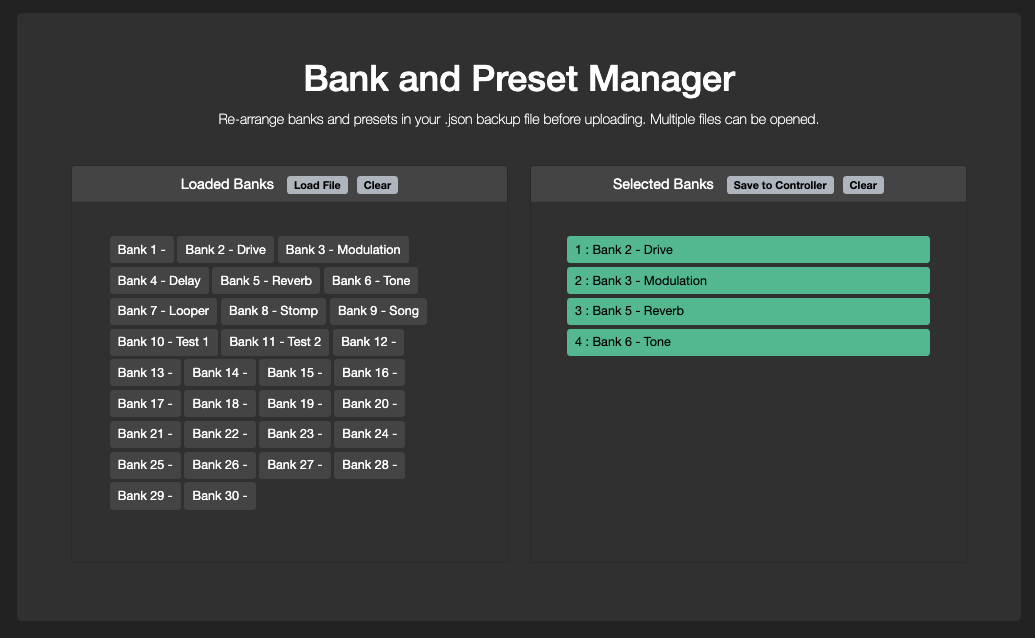 The Bank and Preset manager allows you to re-arrange the banks and preset in your json data dump file before loading it into your controller.