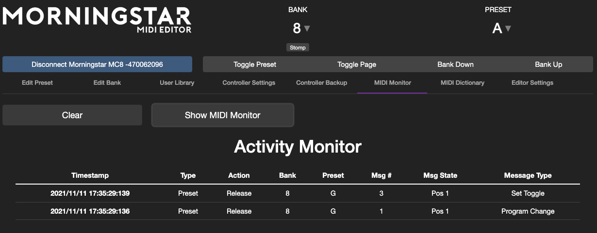 The Activity Monitor allows you to see all the messages that are being executed when you engage a preset. This is useful for troubleshooting purposes.