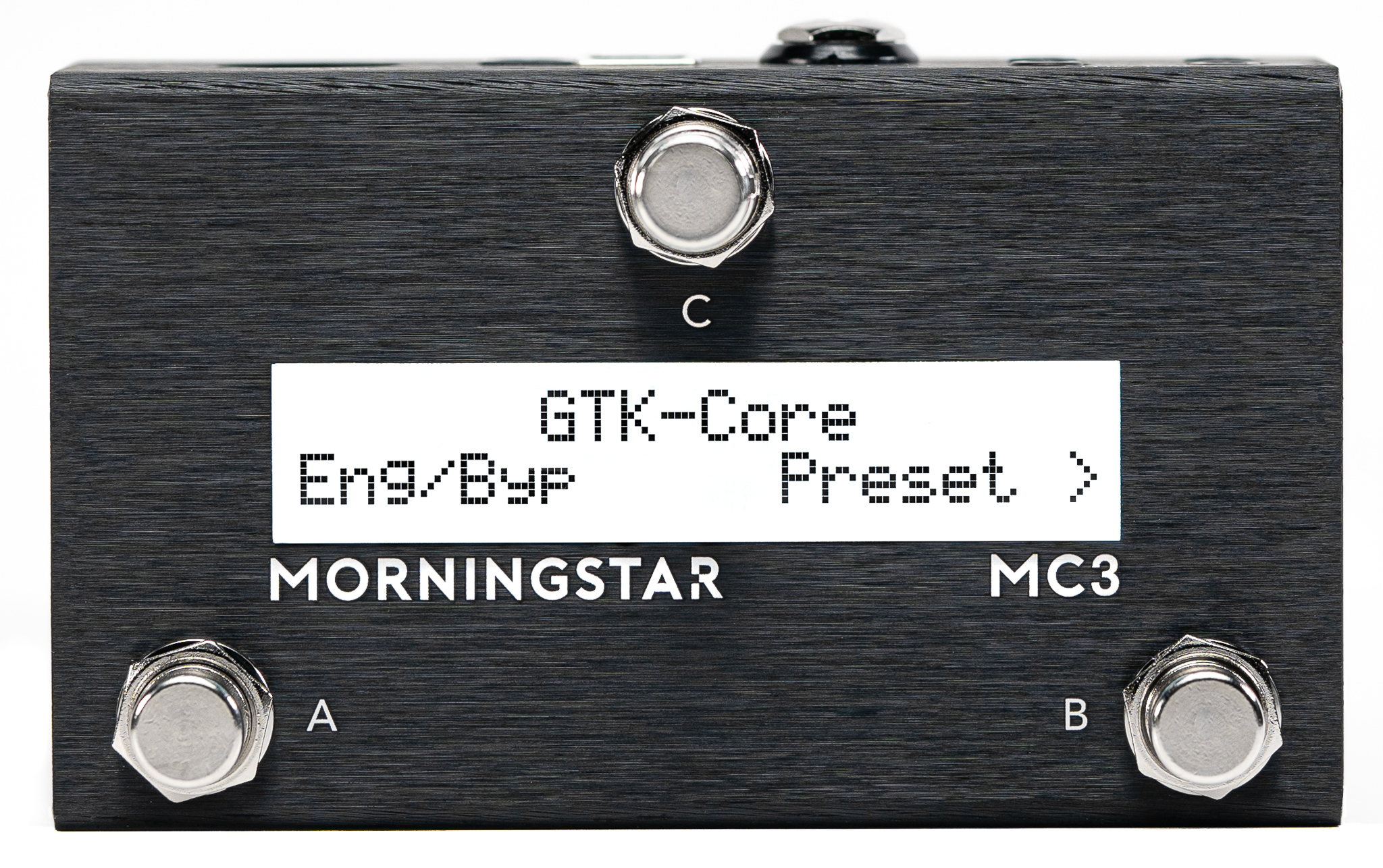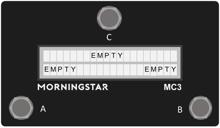 The MC3 has 3 foot switches A, B and C. Each switch corresponds with the text closest to it on the LCD display. Each switch on your Morningstar controller can send any combination of up to 16 different MIDI messages of your choice. By default all switches are EMPTY and not programmed to send any MIDI messages. It’s up to you to decide what you want!