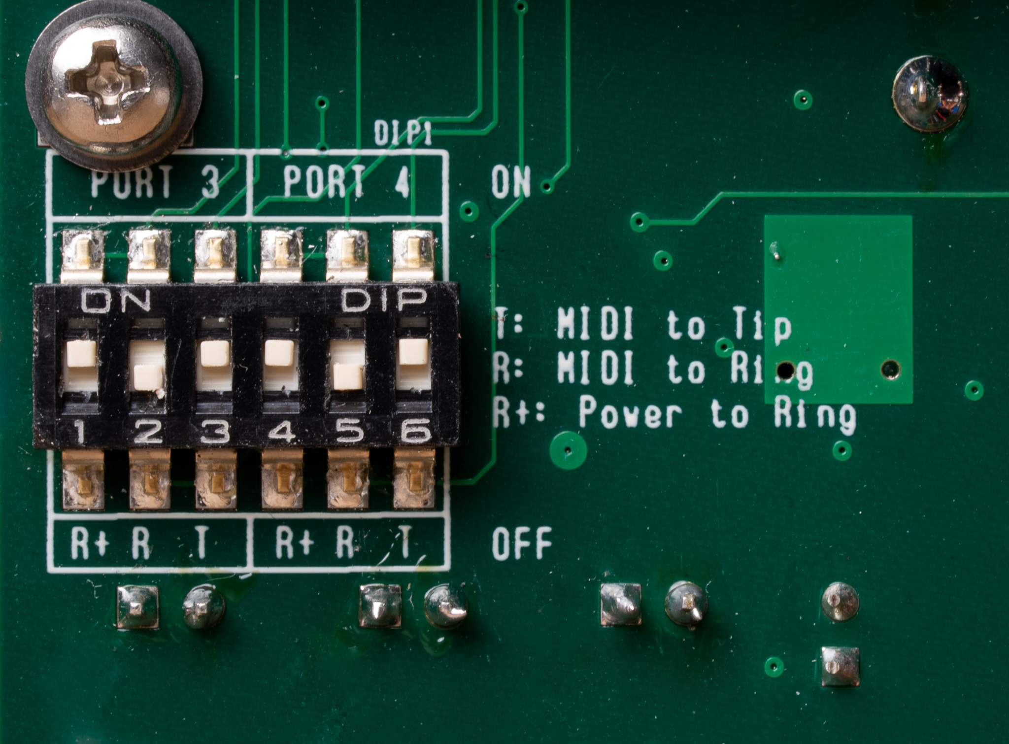 By using the internal dip switches, Ports 3 and 4 are switchable and can be configured to send MIDI via the Tip or Ring. You can also set each port to have its Ring powered or unpowered, according to what your receiving device needs. This makes the MC3 compatible with Type A, Tip only and Ring only setups.
