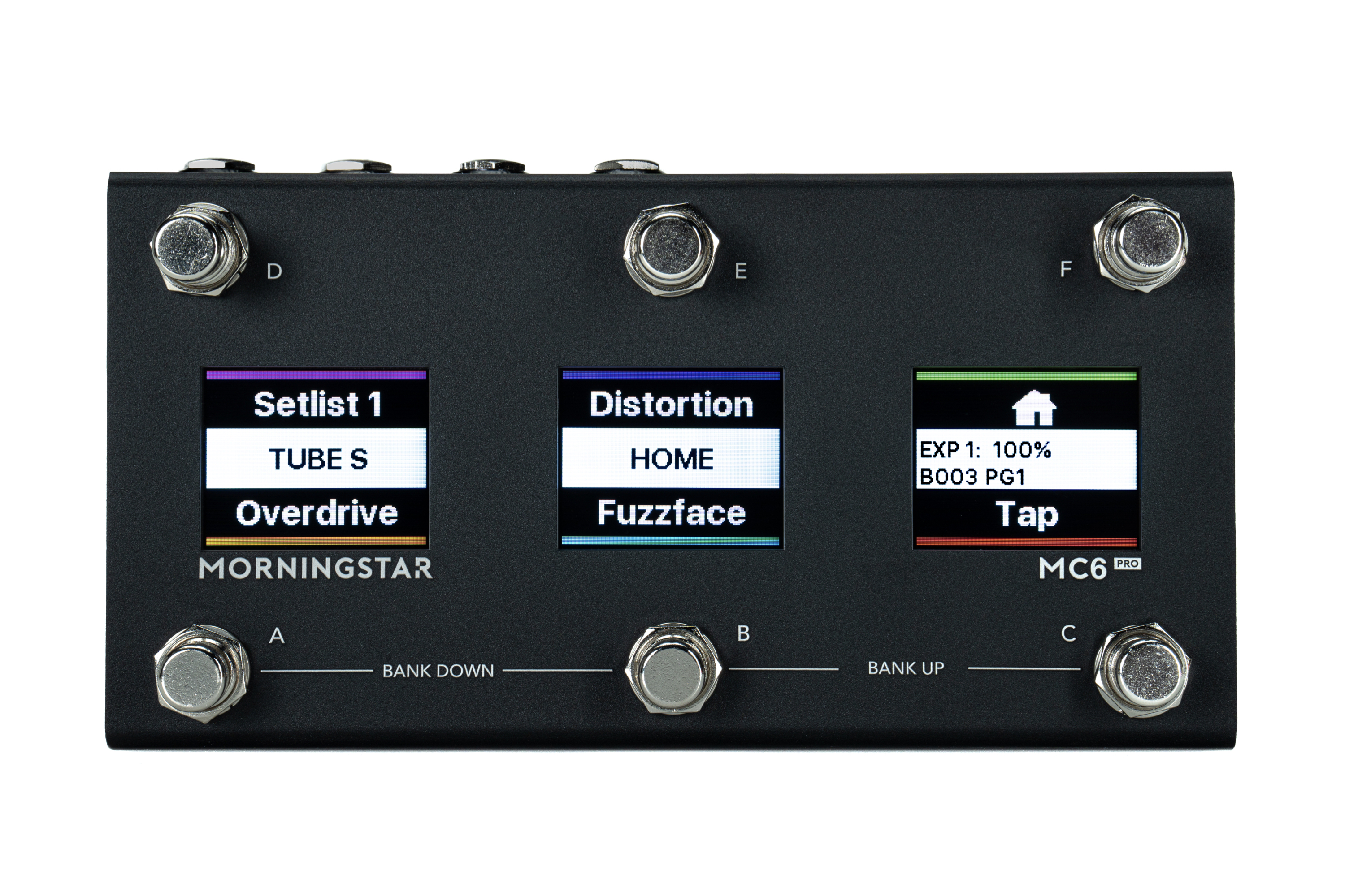 The MC6 PRO has 6 foot switches A to F. Each switch corresponds with the text closest to it on the LCD display. Each switch on your Morningstar controller can send any combination of up to 32 different MIDI messages of your choice. By default all switches are EMPTY and not programmed to send any MIDI messages. It’s up to you to decide what you want!