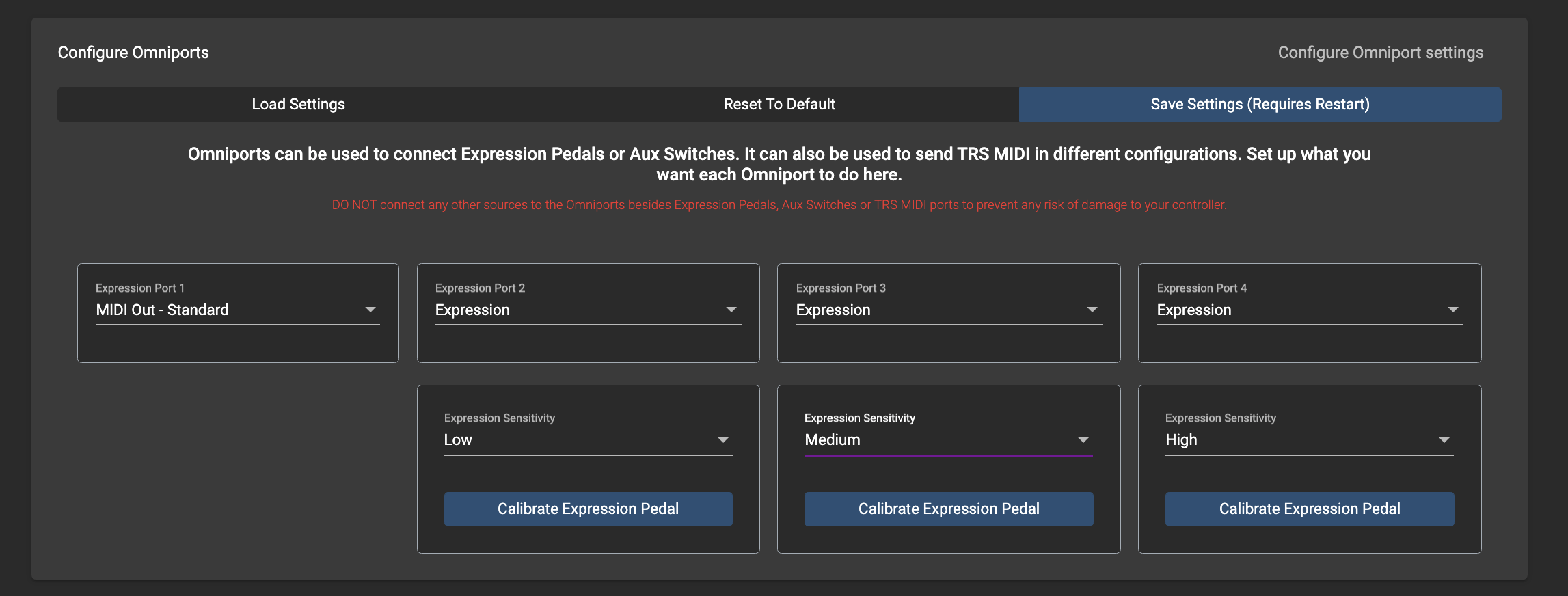 After connecting a new expression pedal, be sure to calibrate it before use. This is to set the correct heel and toe positions relative to CC values 0-127 and allow you to use the full sweep of your expression pedal. Enter calibration mode by pressing [D+F] to access the Main Menu > Edit Expression > Calibrate. You can also access this mode from the Editor under Omniport Settings.