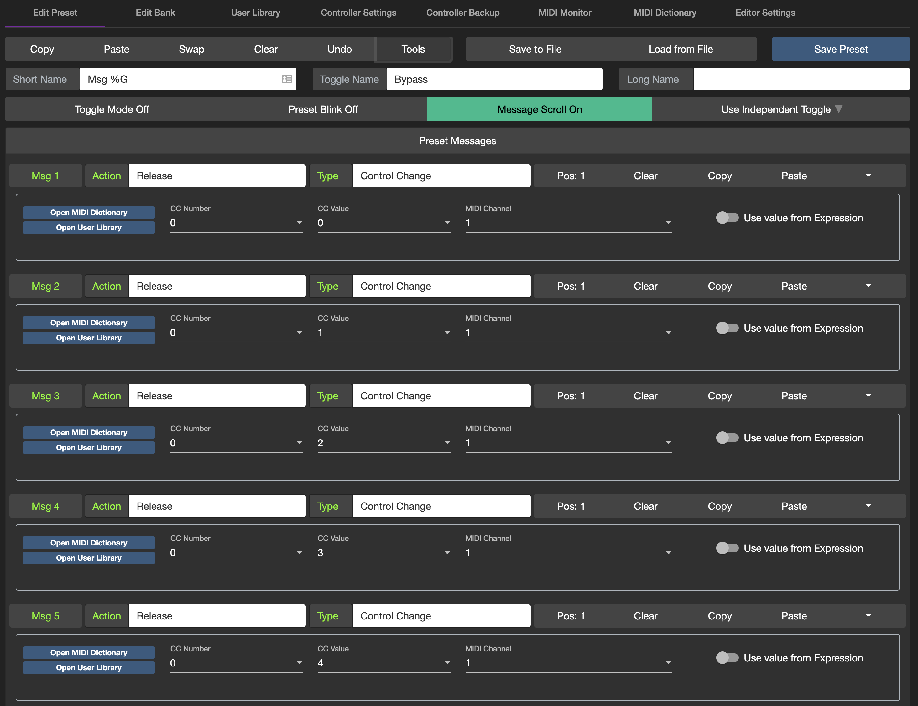 This feature allows you to scroll through each of the 16 messages (or 32 on the MC6 PRO) that is programmed with a Release action in the Preset. In the picture below, I have set the option to Message Scroll On, which means that this Preset Message Scroll mode is now engaged.