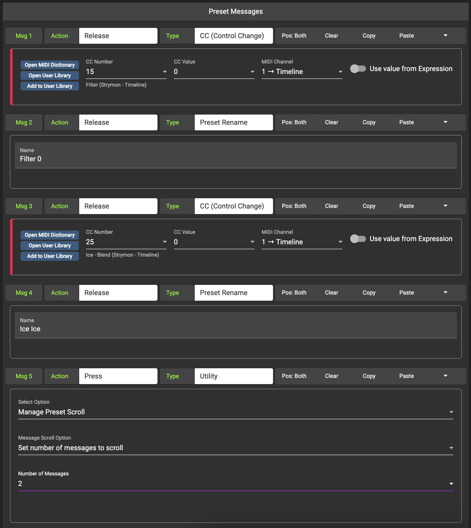 The above setting will send out a CC#15 message and display “Filter 0” on the first release action. On the next release action, it will send a CC#25 message and display”Ice Ice”.