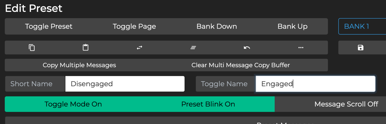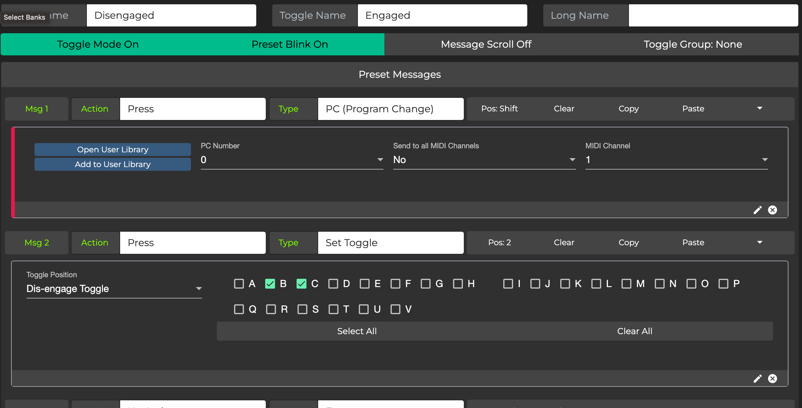 In the above screenshot, I have Preset A to Toggle each time it is engaged. I also have a Set Toggle message added to disengage the Toggle of Preset B and C. So, if Preset B or C is toggled and blinking, engaging Preset A will toggle Preset A, while at the same time disengaging Preset B and C if they are engaged.