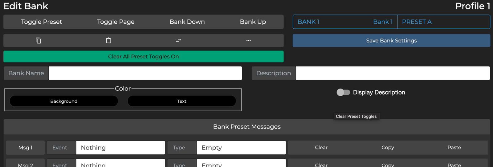 If you only want to clear the Preset Toggle states of specific Presets in the Bank and not all the Presets, you can utilise the Set Toggle message type, instead of using the Clear Preset Toggles setting in the Bank Settings (remember to turn it off).
