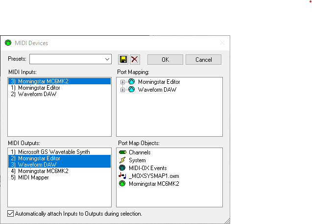 Now, if I open the Morningstar Editor and select a device to connect, I will be able to see the Morningstar Editor virtual MIDI port I created earlier.