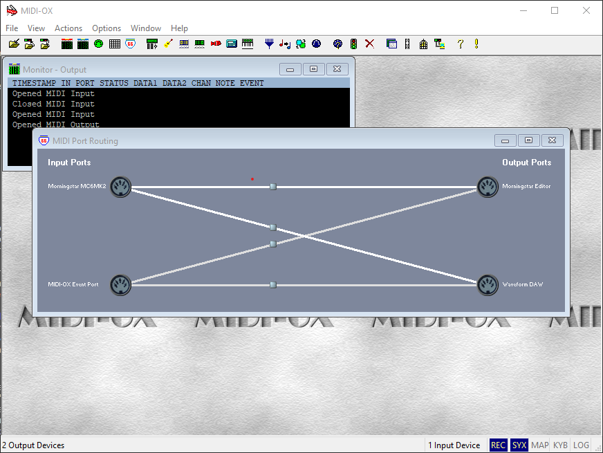 Now we’re ready to configure MIDI-OX to do something with these ports.