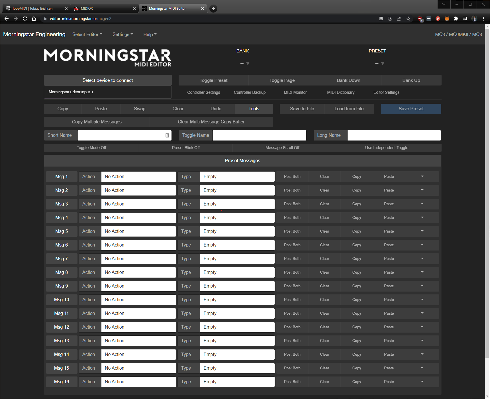 Because the Morningstar Editor also connects to the MC3/6/8 via a MIDI port, that means that you will not be able to use a MIDI Application like Ableton and the Morningstar Editor at the same time.