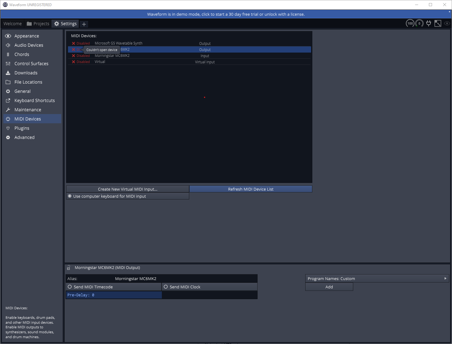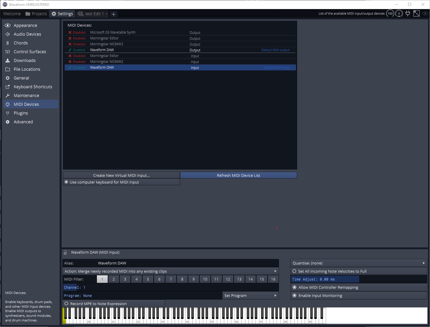 Navigating to the Waveform DAW, I can now see the virtual MIDI ports that I created as well. This time, I will connect to my Waveform DAW virtual MIDI port. This will allow me to use my MC6 to control the DAW as well.