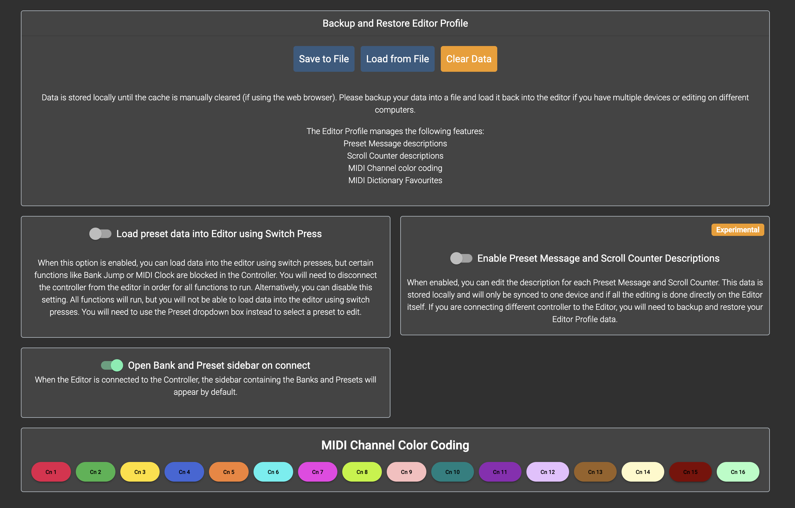 The MIDI Channel colour codes can be sorted in the Editor Settings tab. The MIDI Channel Color Coding settings is backed up together with the Editor Profile data. So when using different controllers in the Editor, you may want to load the Editor Profiles for your different controllers.