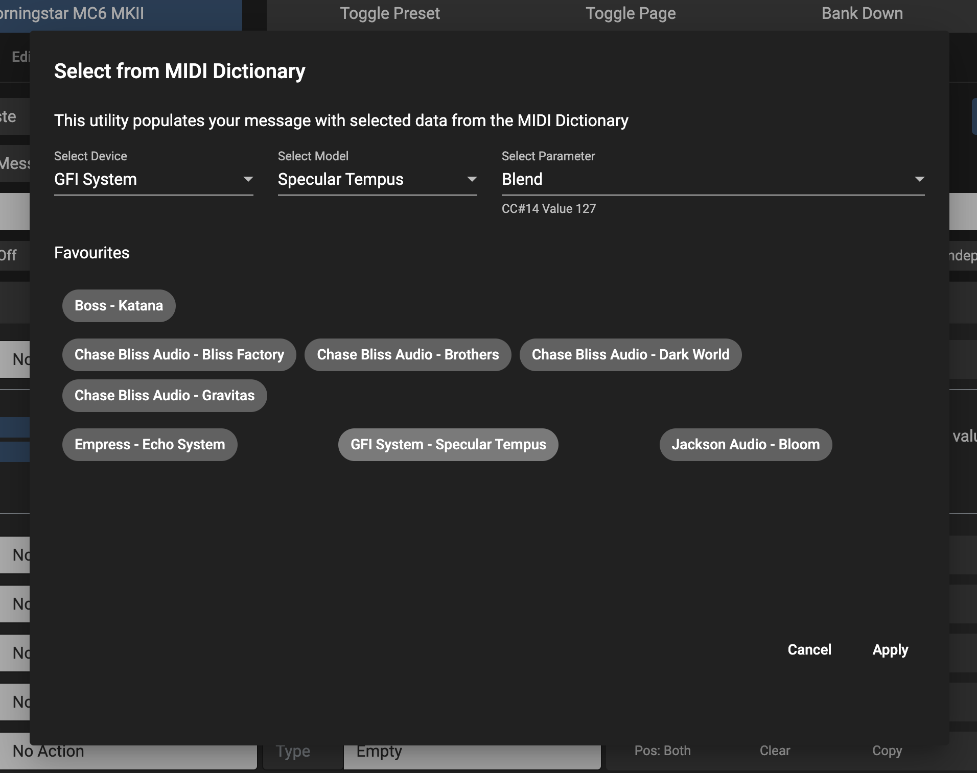 When utilising the MIDI Dictionary when creating CC Messages, the favourite devices will also appear in the dialog box, where you can click on the desired device to quickly load the device CC parameters.