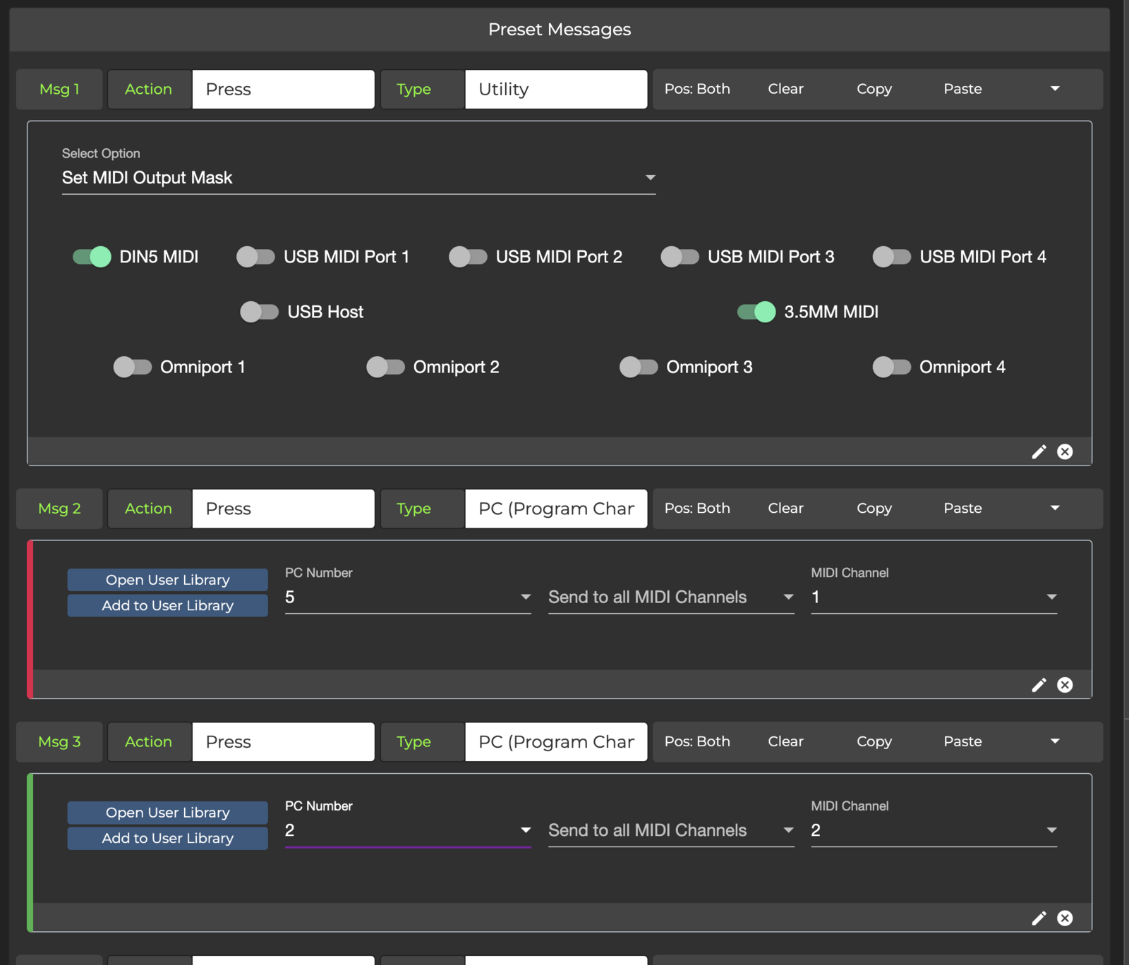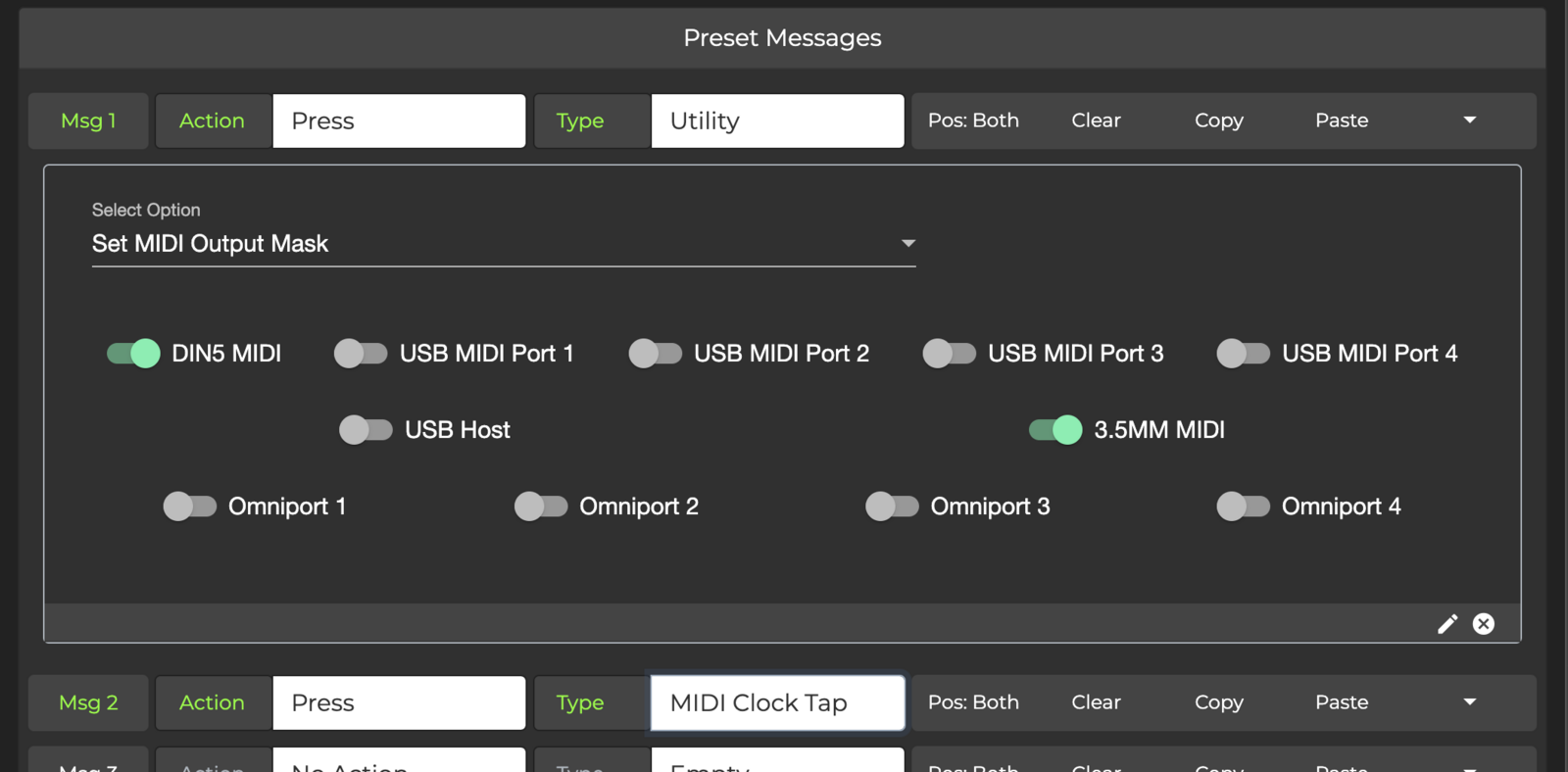 Then, add your MIDI messages after. In the example above, I added the MIDI Clock Tap message, so tapping in a tempo will limit the MIDI Clock output to the DIN MIDI and 3.5mm MIDI port.