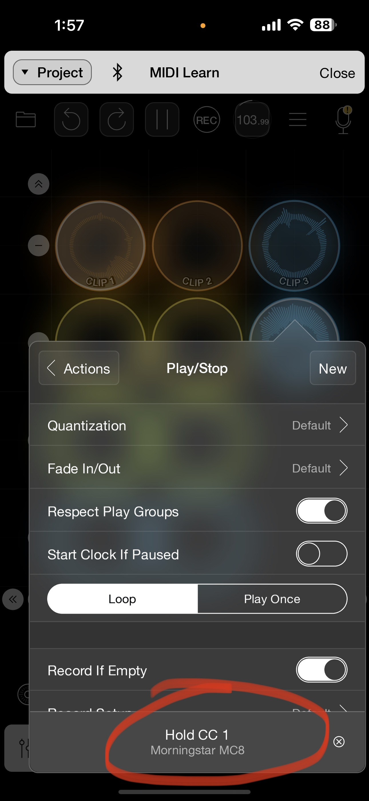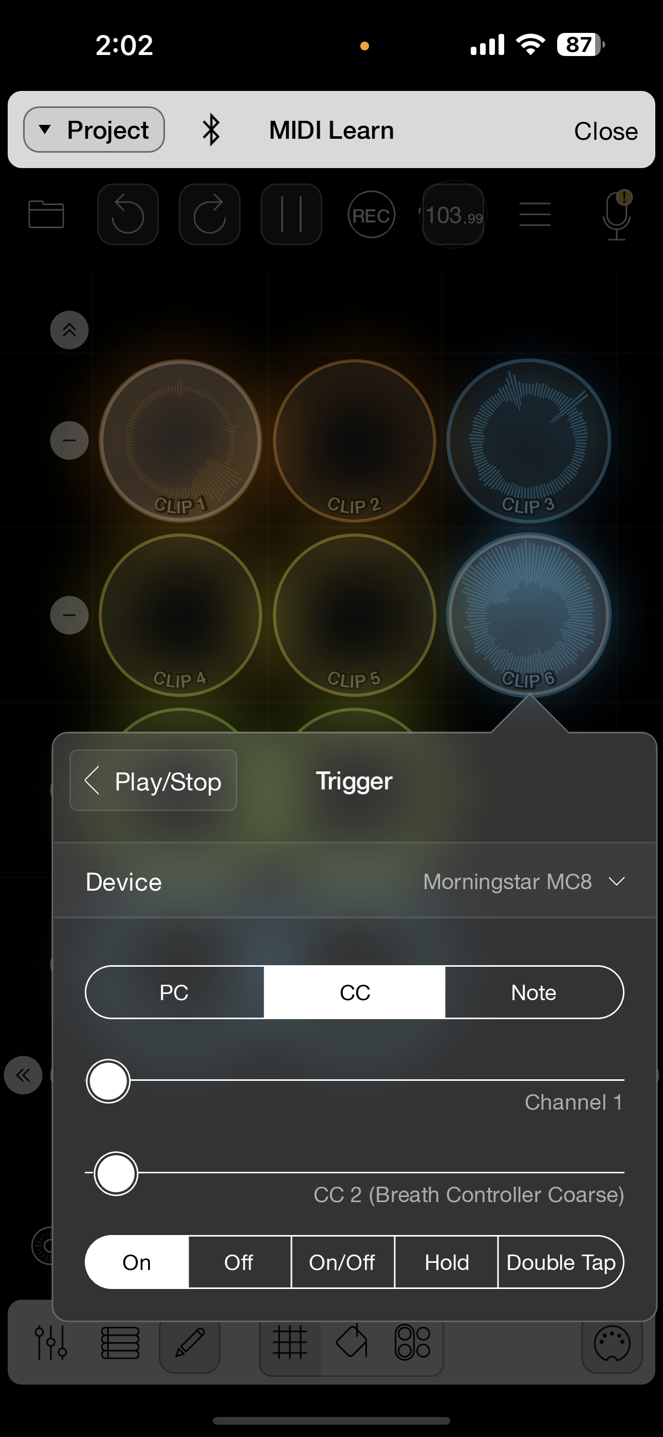 If using CC messages to trigger functions with the MIDI Learn feature, Loopy Pro expects a CC value 127 and value 0 message. If you are only sending a CC value 127 message, Loopy Pro will see it as a switch being held down and the MIDI Learn feature will adjust as such: