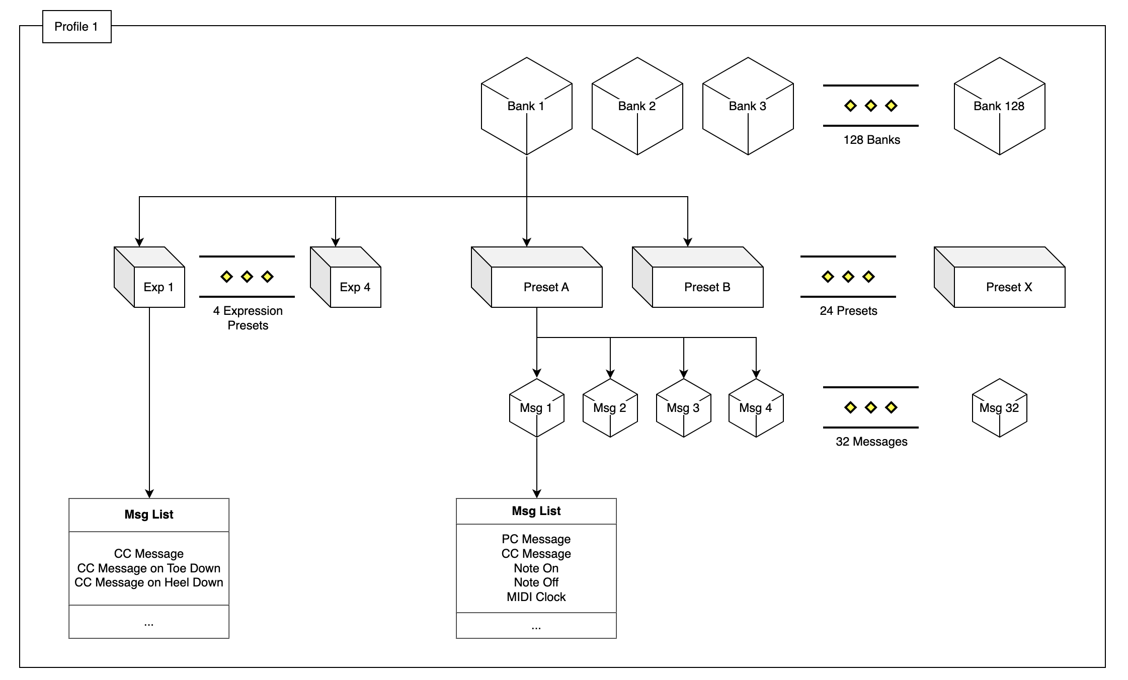 Profiles are completely independent and cannot interact with each other. For example, you cannot engage a preset in Profile 2 from Profile 1, or jump from a bank in Profile 1 to a bank in Profile 2.