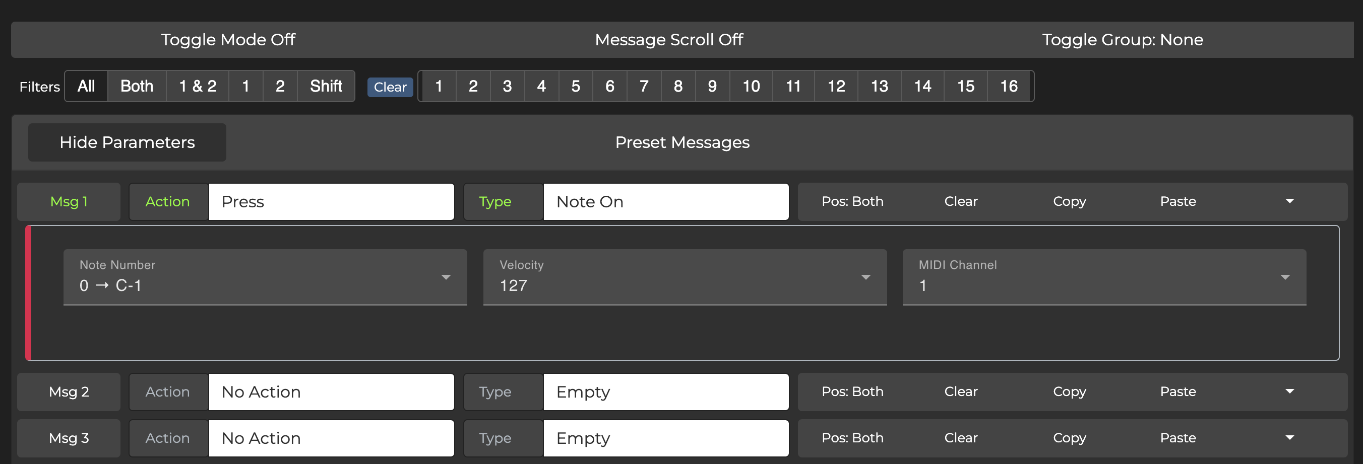 MIDI mapping for Neural plugins works the same in Ableton Live as the standalone plugin. However, one quirk we noticed is that CC messages do not work for MIDI mapping, instead you need to use Note On messages (Note Off not required). Also, the base C used is different from what we use on our controllers. C-0 on a Morningstar does not correspond with C-0 in the Neural plugin. Instead, Morningstar Note 0 → C-1 corresponds with Neural C-0. See below for an example of what works.