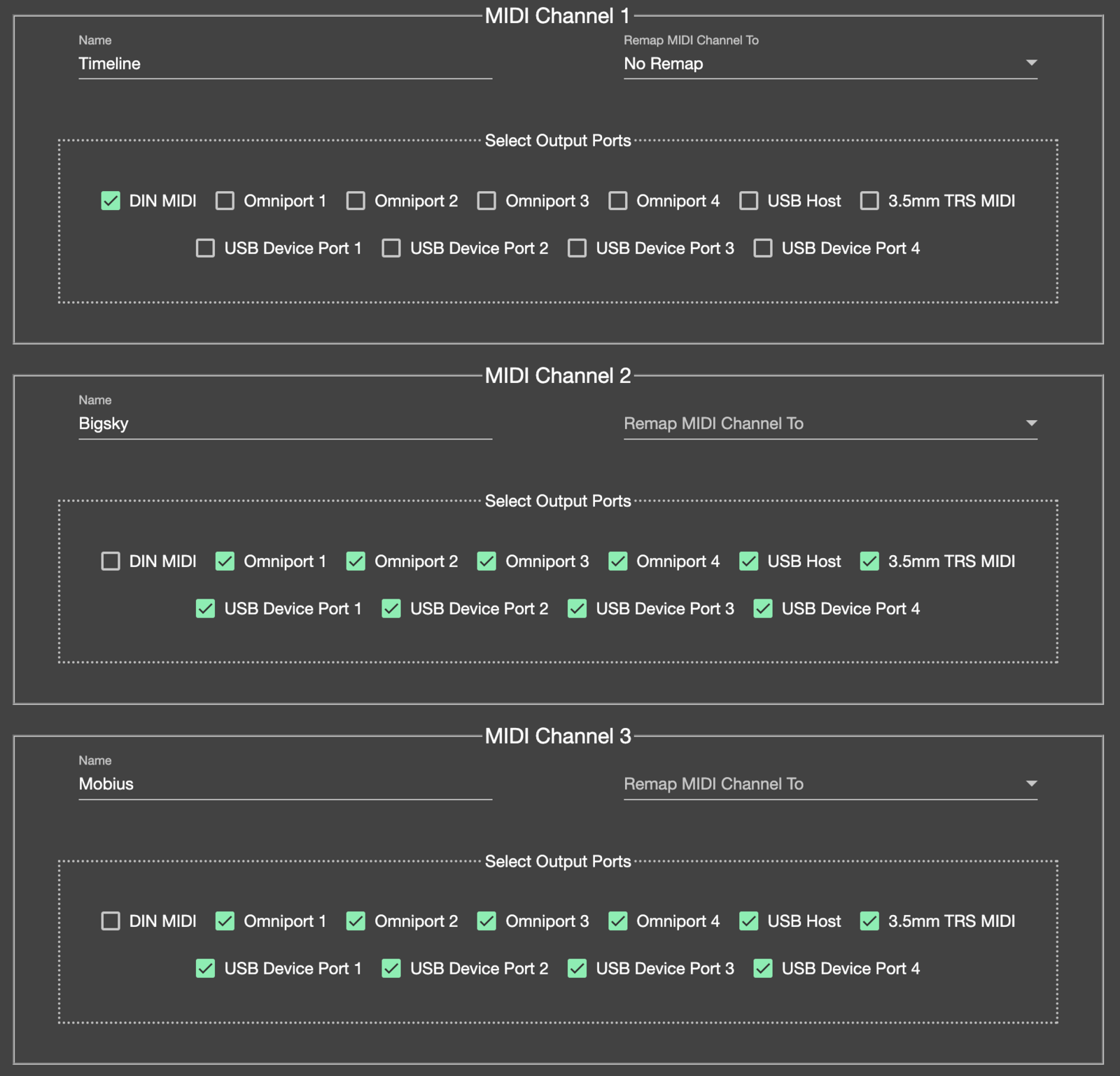 If you need to limit a MIDI message to be sent out only to a specific port (i.e. Omniport 1), you can do that in the MIDI Channel Settings.