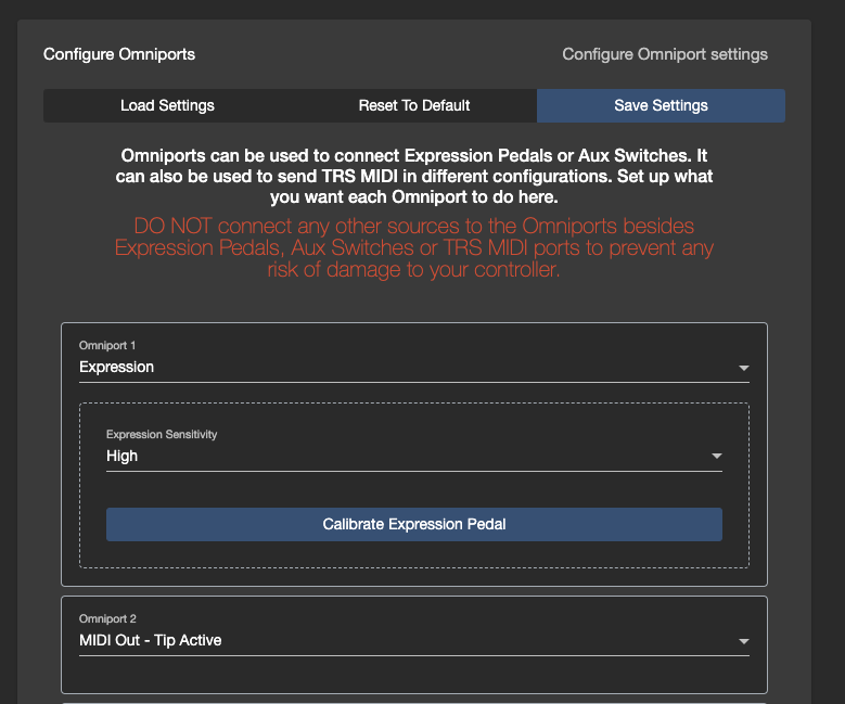 Expressionas the Omniport setting and then set theExpression Sensitivitybefore clicking onSave Settings. At this point, you will not be able to calibrate the Expression pedal. The controller needs to be restarted in order for the new Omniport settings to load.