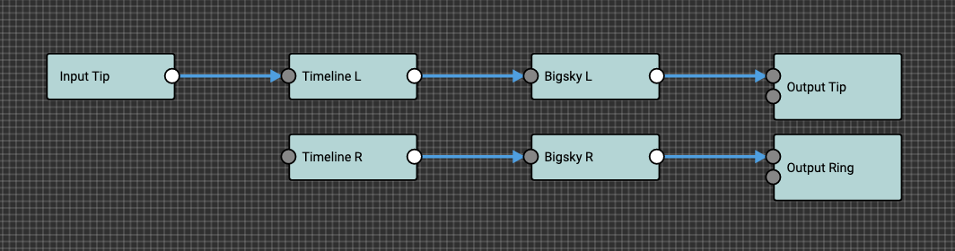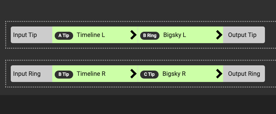 In this example, a mono signal is send to the Input Tip (Input Ring is not used). A Tip Send is connected to the Timeline L Input. The stereo outputs from the Timeline is then returned to A Tip Return and B Tip Return. B Tip Send is not used. The stereo signal is then further routed to the Bigsky L and R ports and then to the Output Tip and Ring ports.